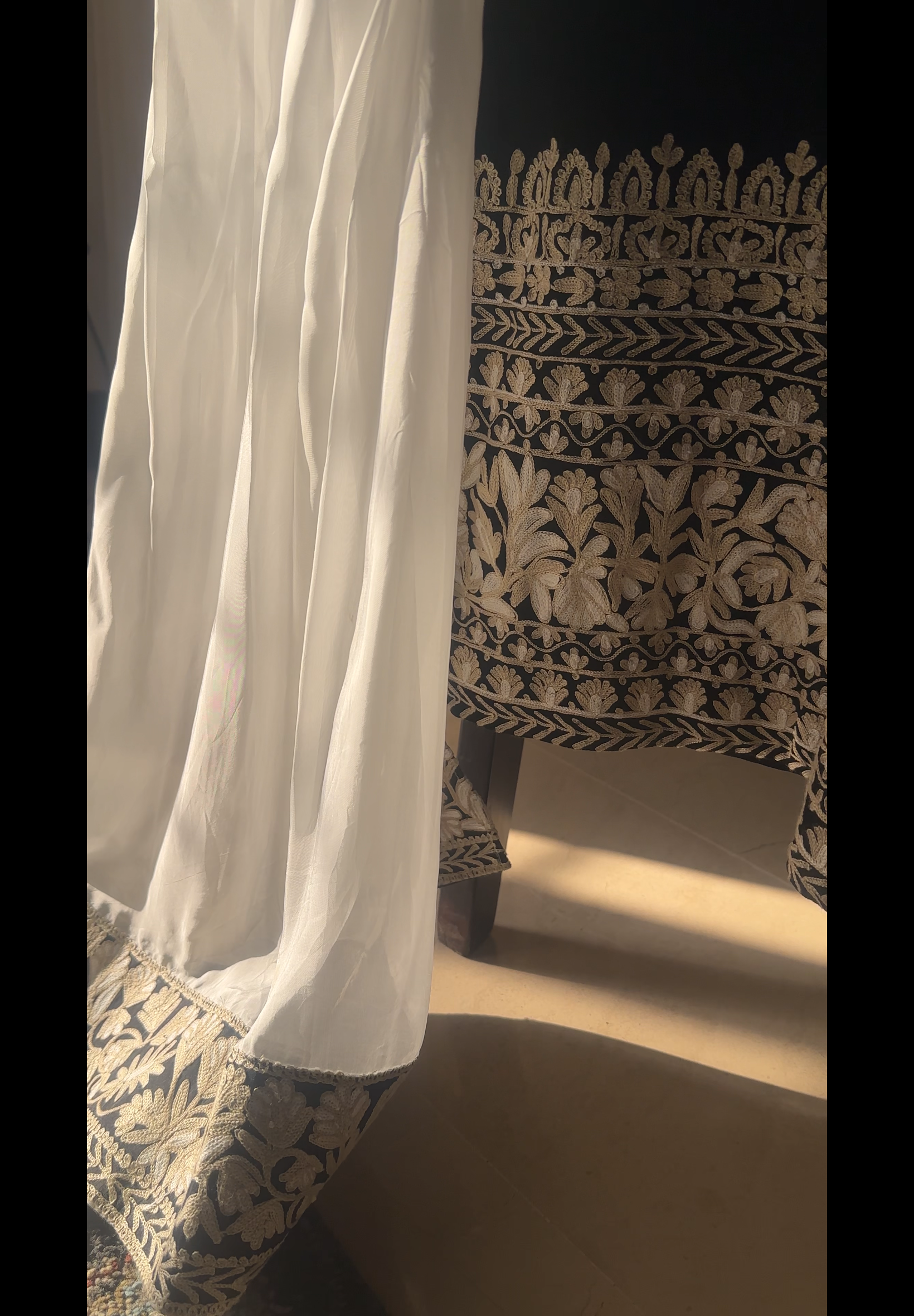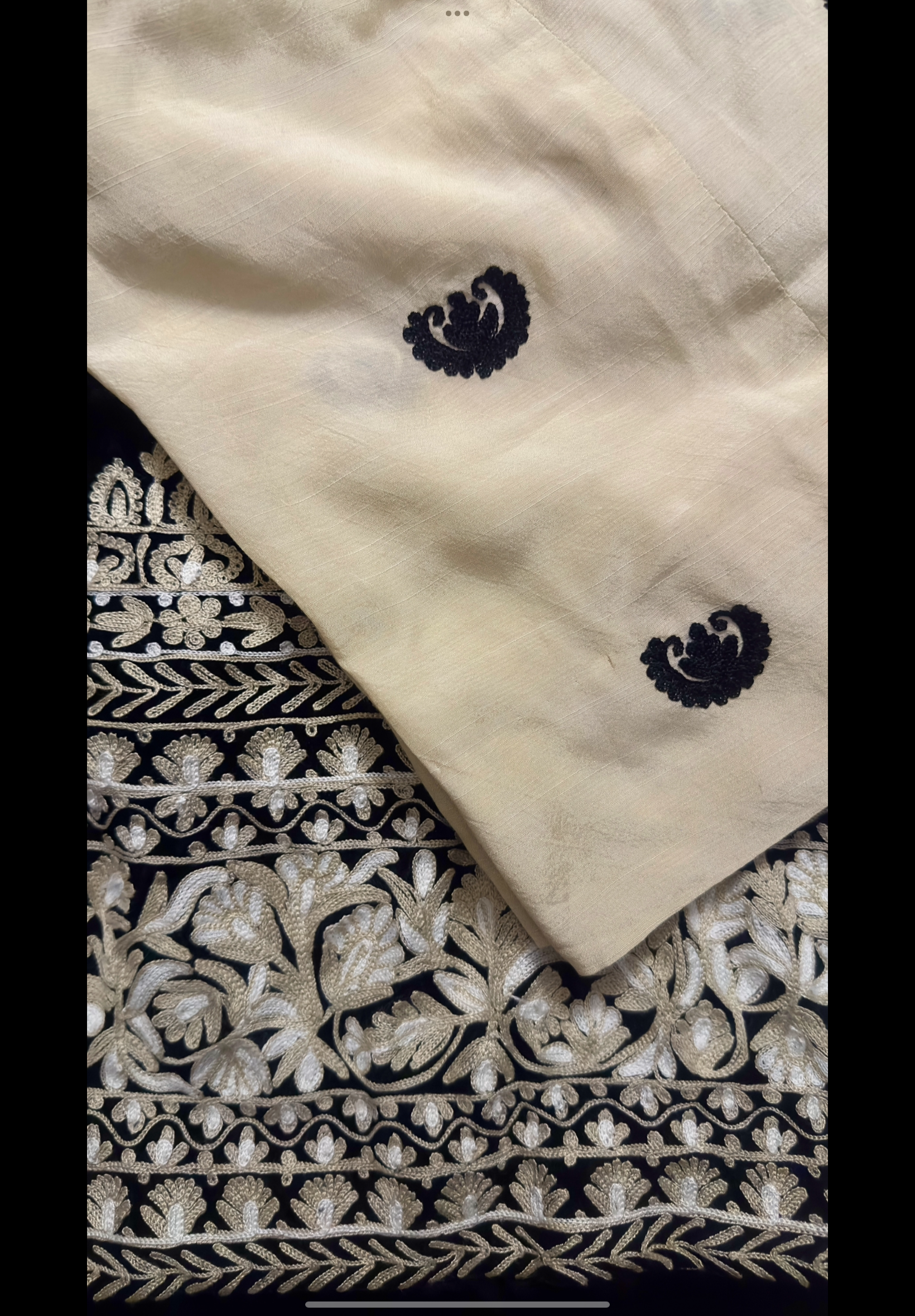 -Beige izaar with black embroidered motifs.