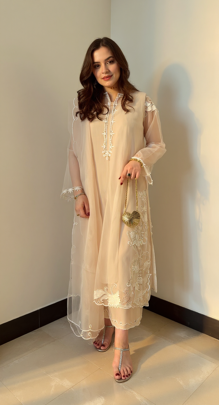 A stunning beige outfit, based on pure organza featuring stunning applique motifs and embroidery. Paired with embroidered silk pants and a beautiful scalloped organza dupatta.