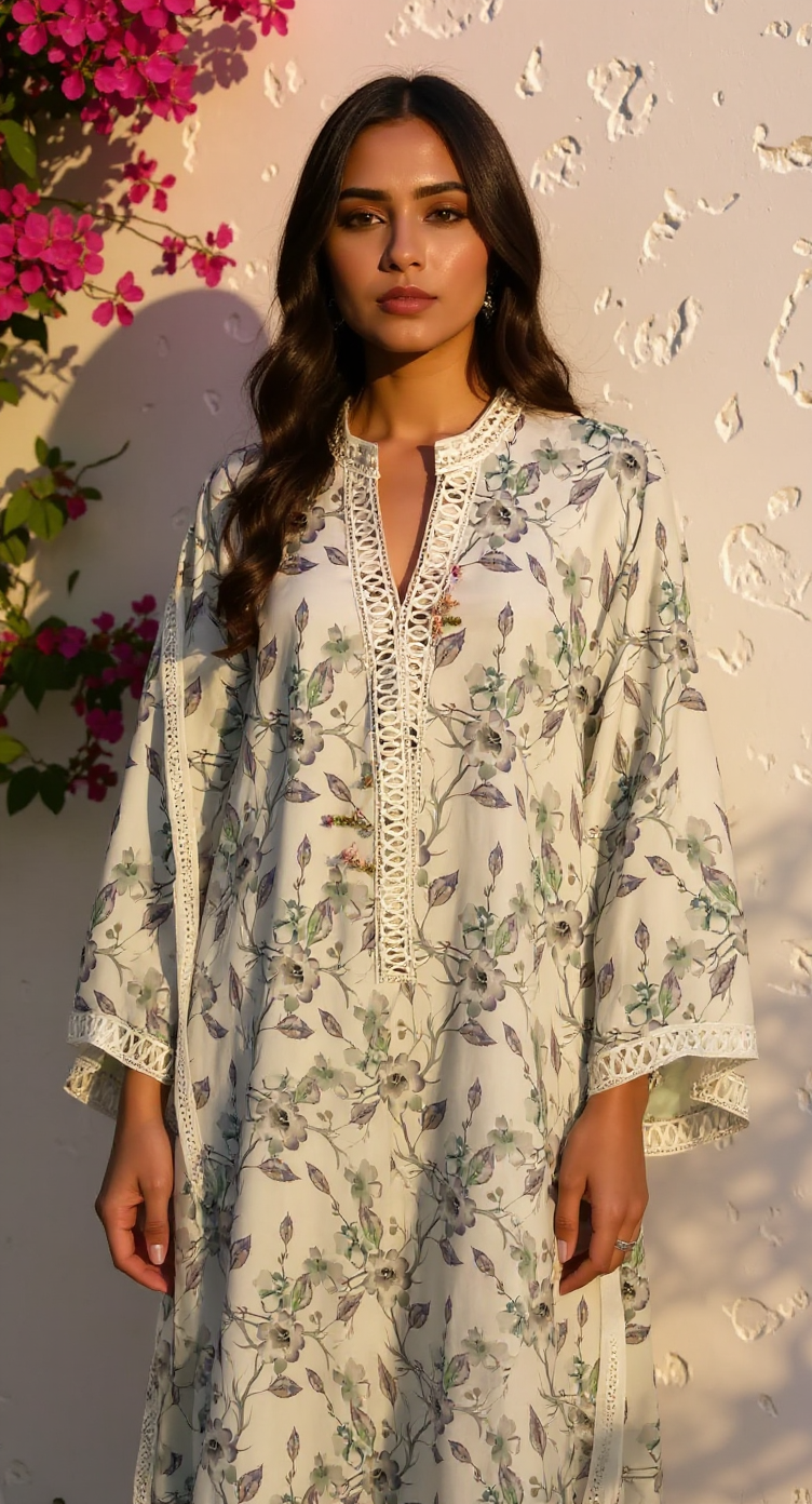 A floral summery kurta with drop shoulders, lace detailings and hand embroidered flowers along the neckline for that extra oomph.