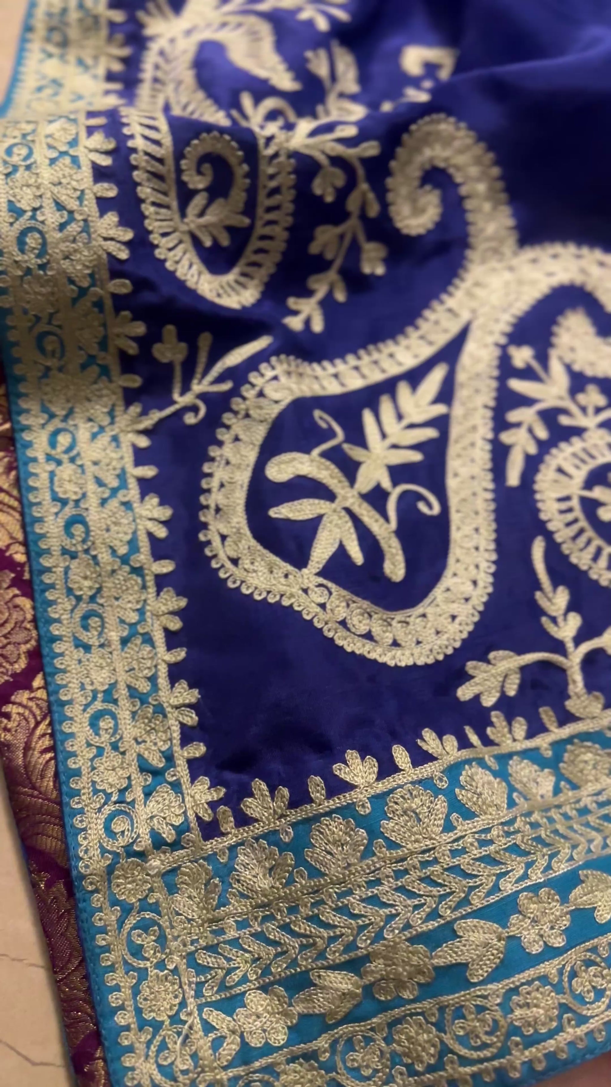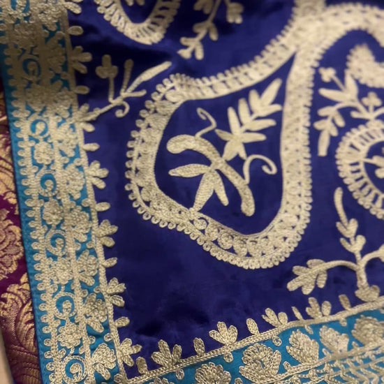 A bright Azure silk ensemble featuring beige Aari work on the front, back, sleeves and dupatta. Featuring turquoise pattis and plum jamawar trims, this outfit ticks all the boxes for a perfect festive look. The outfit comes as three pieces: