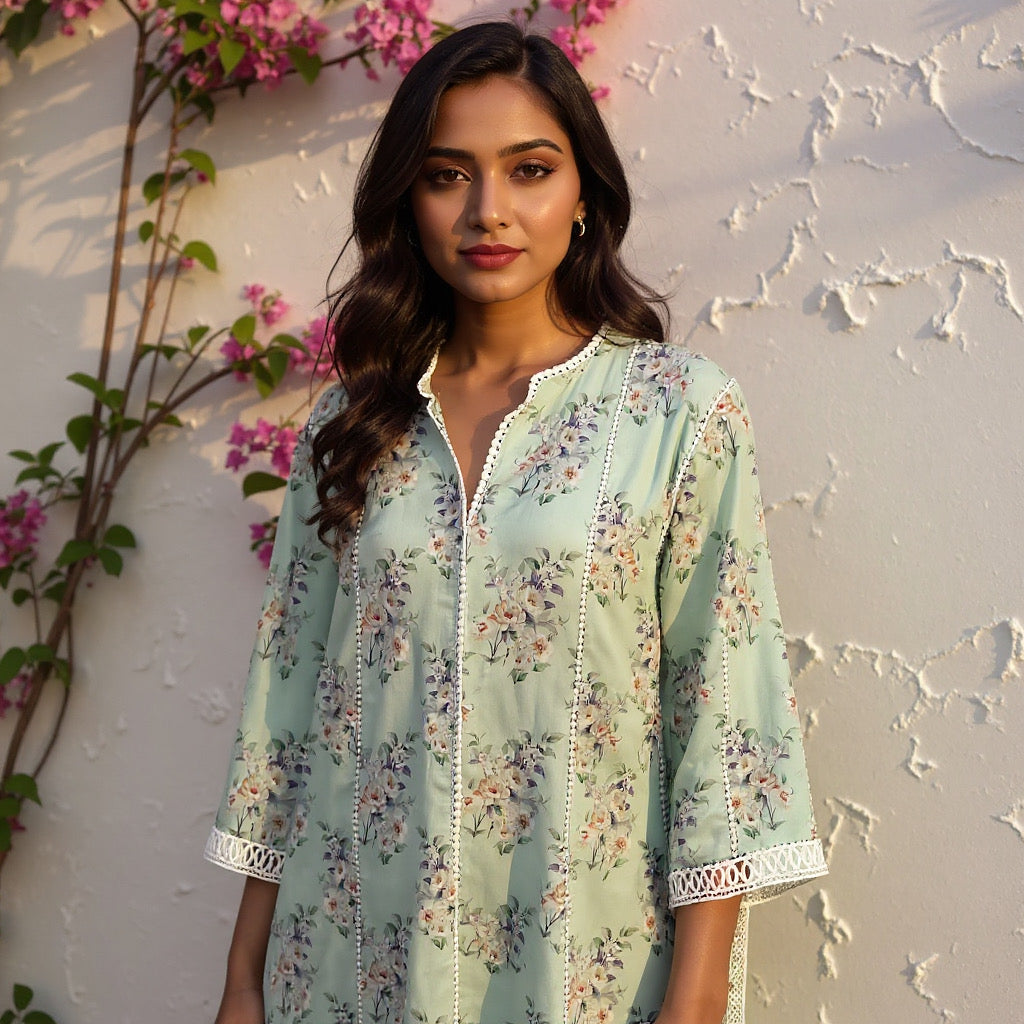 A basic floral kurta with a vibrant summery print, lace detailings and impeccable stitching.