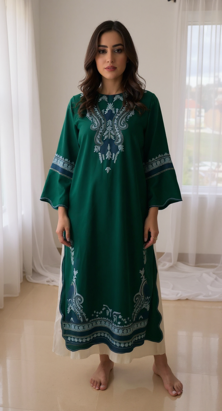 A deep green karandi kurta embroidered with shades of blue featuring scalloped sleeves and cutwork daman. The perfect statement kurta to dress up or down.